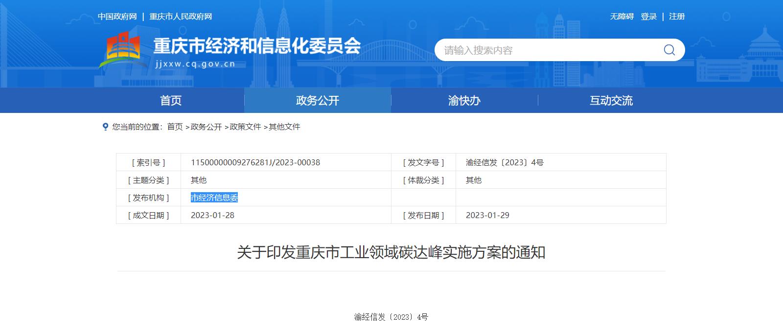 1月29日,市经济信息委发布《关于印发重庆市工业领域碳达峰实施方案的通知》。