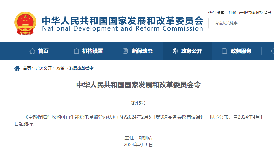 3月18日,国家发改委下发中华人民共和国国家发展和改革委员会令第15号,公布《全额保障性收购可再生能源电量监管办法》,该办法自2024年4月1日起施行。《办法》适用于风力发电、太阳能发电、生物质能发电、海洋能发电、地热能发电等非水可再生能源发电。