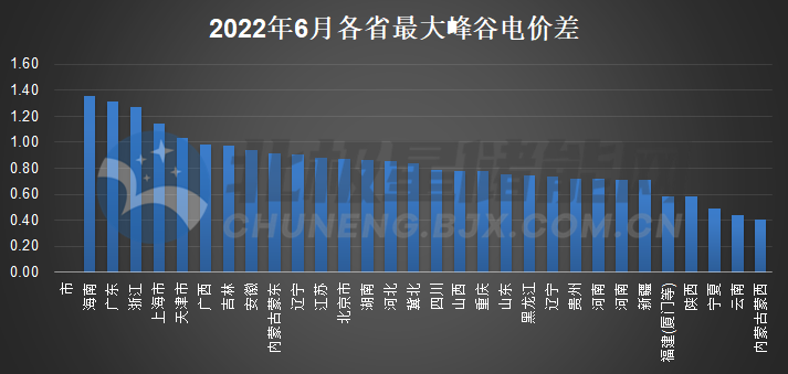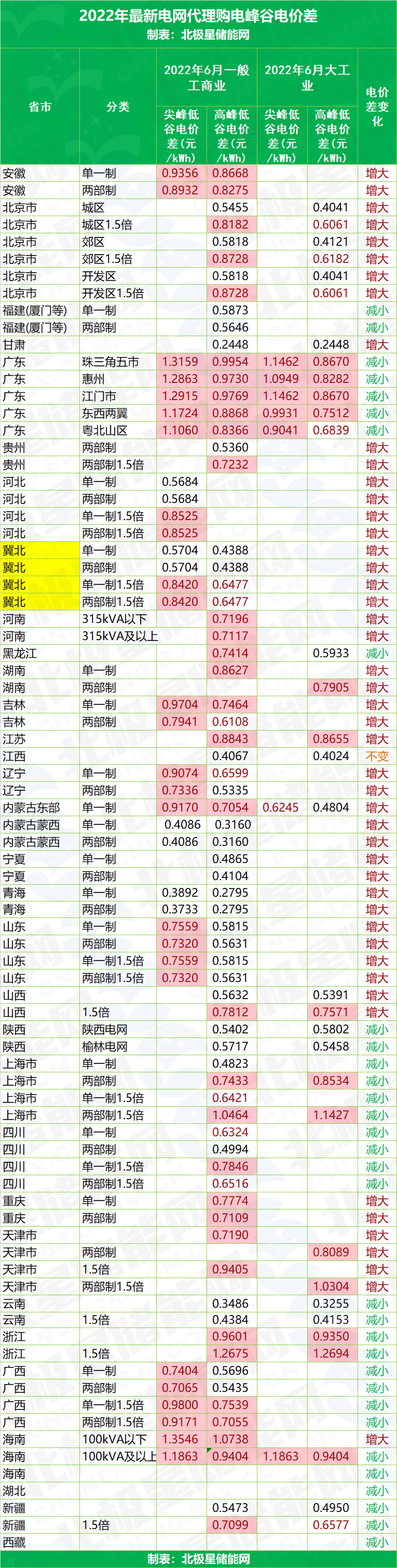 近日,电网公司陆续公布各省电网代理购电价格。随着夏季来临,多省开始执行尖峰电价、峰谷电价差也在进一步拉大。根据北极星储能网统计,6月有18省份峰谷电价差增大,分别为:安徽、北京、甘肃、贵州、河北、河南、湖南、吉林、江苏、辽宁、内蒙古、宁夏、青海、山东、山西、重庆、天津、海南。其中最大峰谷电价差超过0.7元的有22省市。以下为各省峰谷电价差汇总,以及各省电网代理购电价格详表。